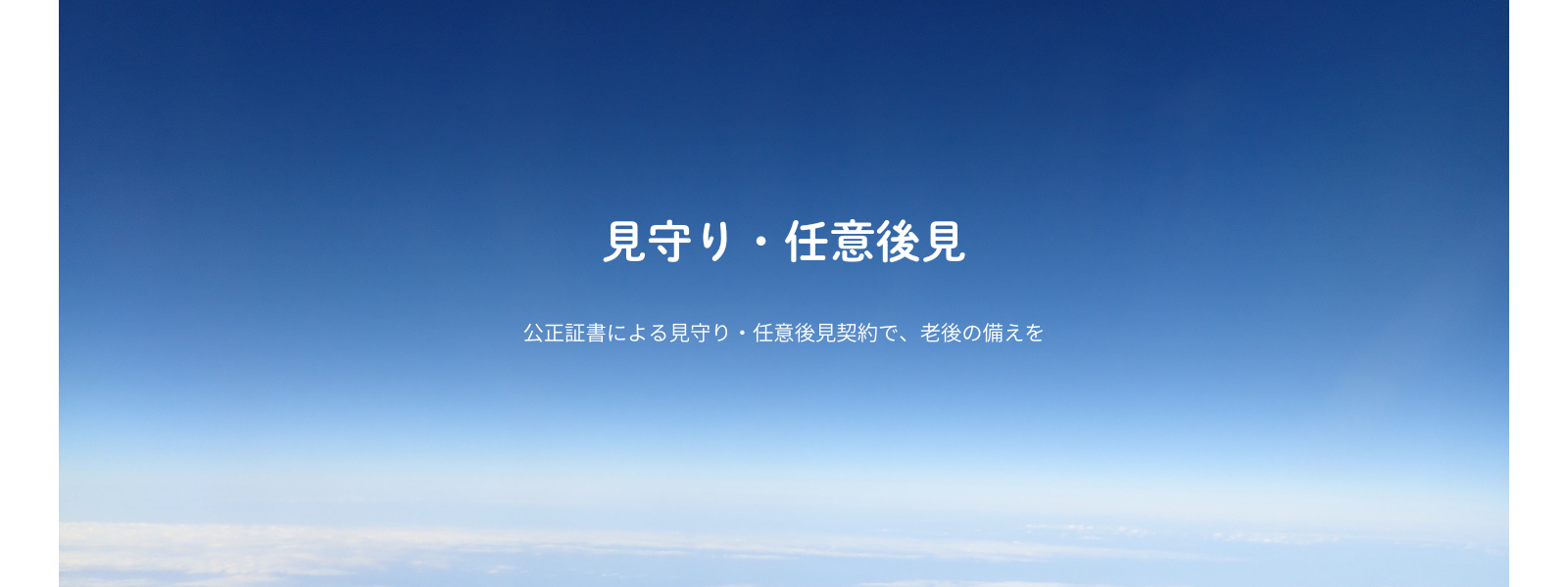 見守り・任意後見 2025-12-142025-12-27 見守り・財産管理委任契約 見守り契約及び委任契約の原案を作成、公証役場で公正証書にします。老後の安心・安全を公正証書によって守ります。 詳しいページへ → 任意後見・法定後見 後見人を前もって指定する任意後見契約。認知症になっても信頼する人の後見が得られる制度です。 詳しいページへ → 見守り・財産管理委任契約と任意後見契約の連携 委任者が十分な判断能力があるときは見守りや財産管理のみのサポート、判断能力が不十分となったときは任意後見で保護を行っていく移行型の委任契約と任意後見契約です。すべて公正証書として法的に安心・安全なサポートを構築します。 詳しいページへ →